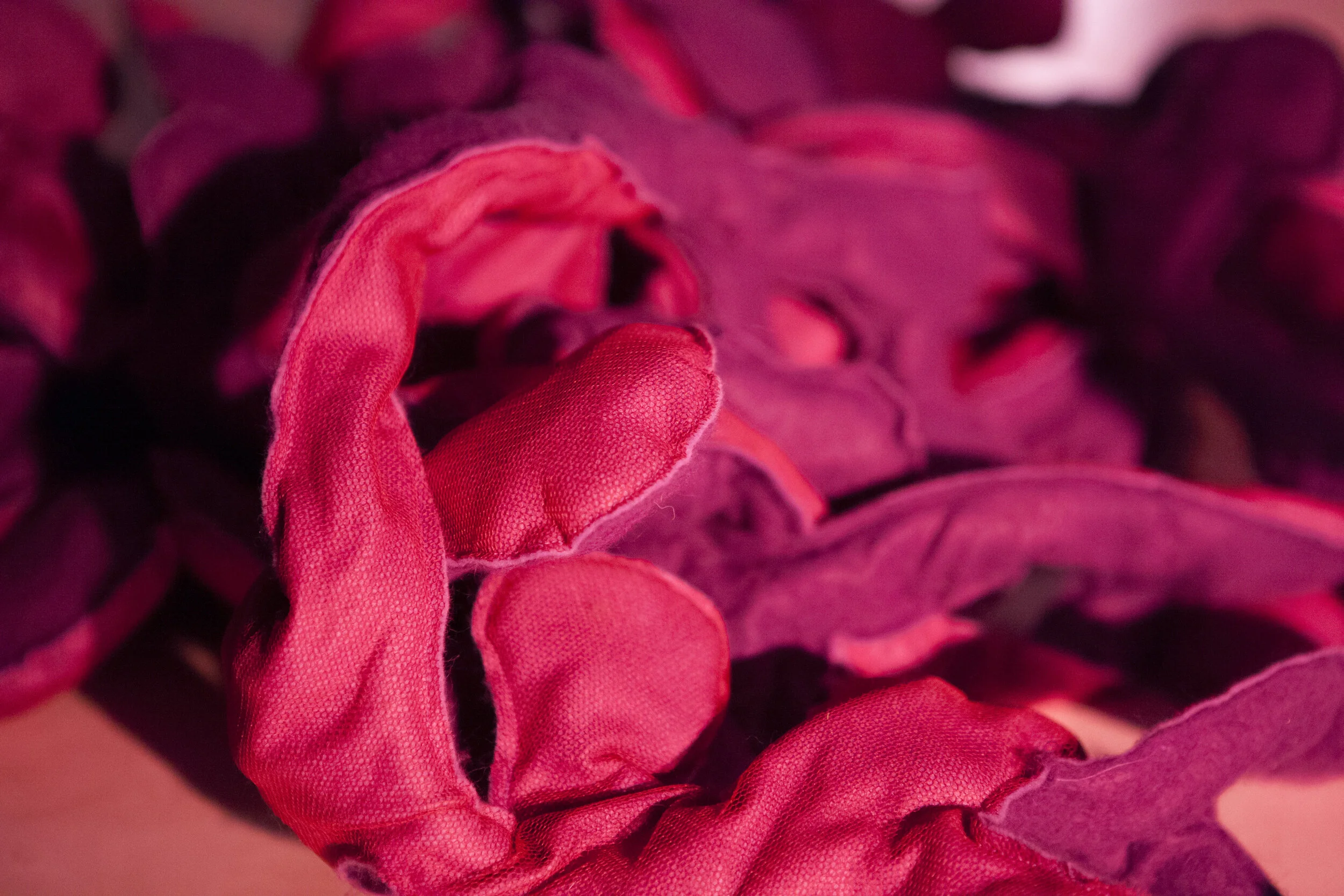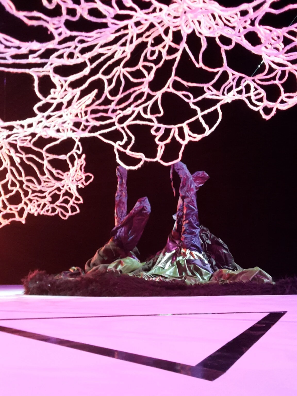 Scenography, as a dynamic form, contributes to the kinesthetic experience of performance and the redistribution of agency, highlighting the non-central role of the dancer. The objects, accessible throughout the performance, are designed to encourage physical engagement and experiential exploration, provide diverse tactile stimuli and respond in various ways to audience interaction. Their form and placement are choreographed to elicit both individual and collaborative play, evoking a sense of intimacy and intrigue. The abstract design, devoid of resemblance to real-life objects, fosters imaginative play. Within such an ecology, through mutual insertion and intertwining, all bodies and materials engage in reciprocal open-ended exchange.